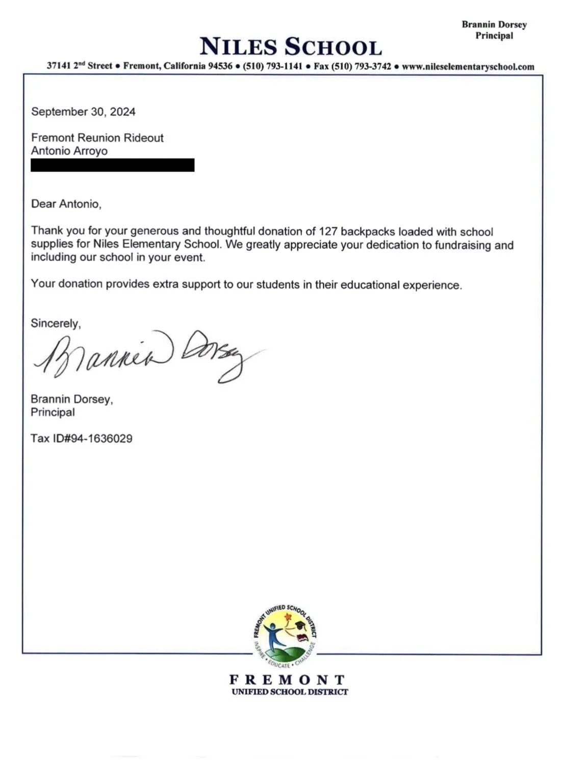 Here’s a letter from Robertson Elementary thanking Niles Bicycles (formerly Baylands Bikes) and I for donating 100+ backpacks to their school! Together we impacted dozens of kids' lives and contributed to a better more educated community.